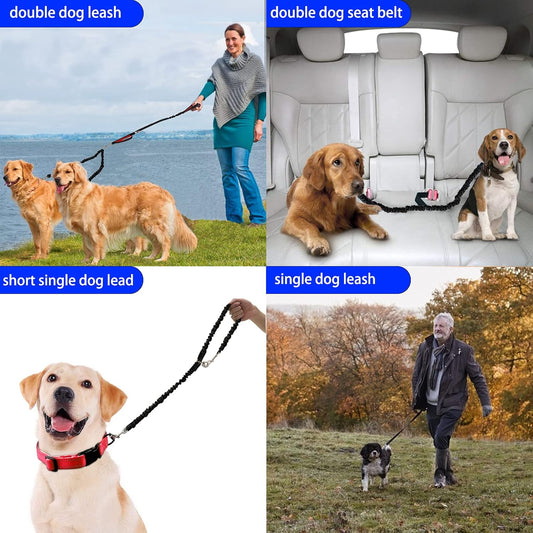 Dual Dog Leash, Double Leash for 2 Dogs Tangle Free Two Dogs Leash 360° Swivel No Tangle Bungee Reflective Double Leash for Medium Large Dogs Walking Training (Black+Red)