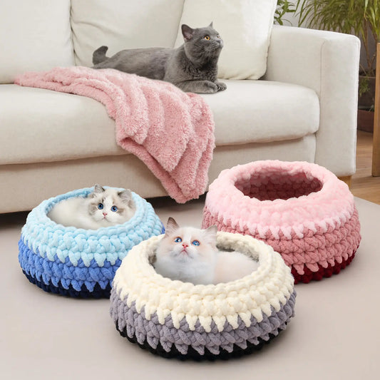 Handwoven Cat Bed – Extra Soft Washable round Cave House for Indoor Kittens, Black/White/Gray
